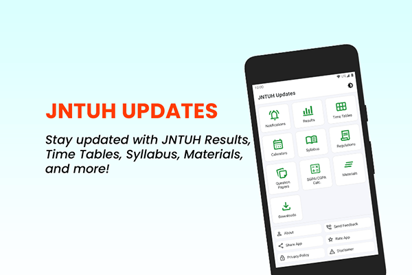 - We developed the JNTUH Updates app to provide students with the latest results, timetables, syllabus links, and academic updates from JNTUH. Our app ensures timely and accurate information directly sourced from the official JNTUH website.