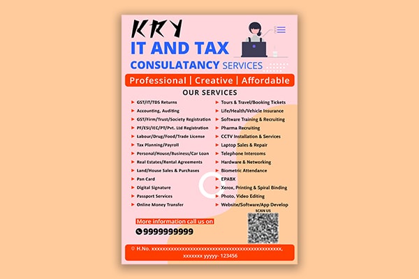 - We developed a pamphlet for Kry IT and Tax Consultancy Services that effectively conveyed the company’s expertise and value proposition. The design process involved collaboration with the client to ensure that the final product met their needs and expectations.